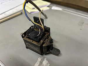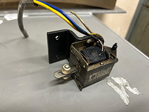 | オイルが付着しやすい場所でもあるのですが、永年整備しないで使い続けることができたのですが、ある日煙が出てきたとのこと。内部を確認すると、マグネットソレノイドの配線が焼け焦げ、線がむき出しになっていました。導通が悪くなったためか?断線はしていませんが、火災が危ぶまれる状況でした。 不調があろうとなかろうと、大事な機械ほど、忙しい時に限って壊れます。 年に一度の定期メンテナンスをご用命下さい。 |