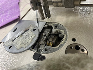 | 普段樹脂バーを縫っている機械。 最近糸が切れるというので分解したら、大量のプラスチック粉塵と油が混ざったものが、釜の内部に鍾乳洞のような壁を構築していました。 掃除で治りますので確認します。 |